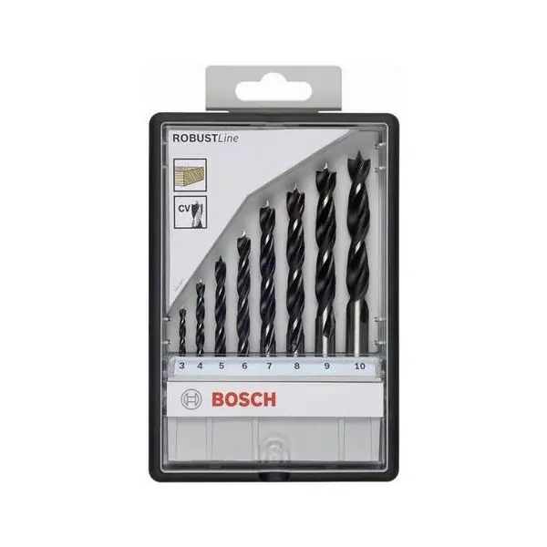 8-delars träspiralborrsats Ø 3, 4, 5, 6, 7, 8, 9 och 10 mm i praktisk förpackning.
