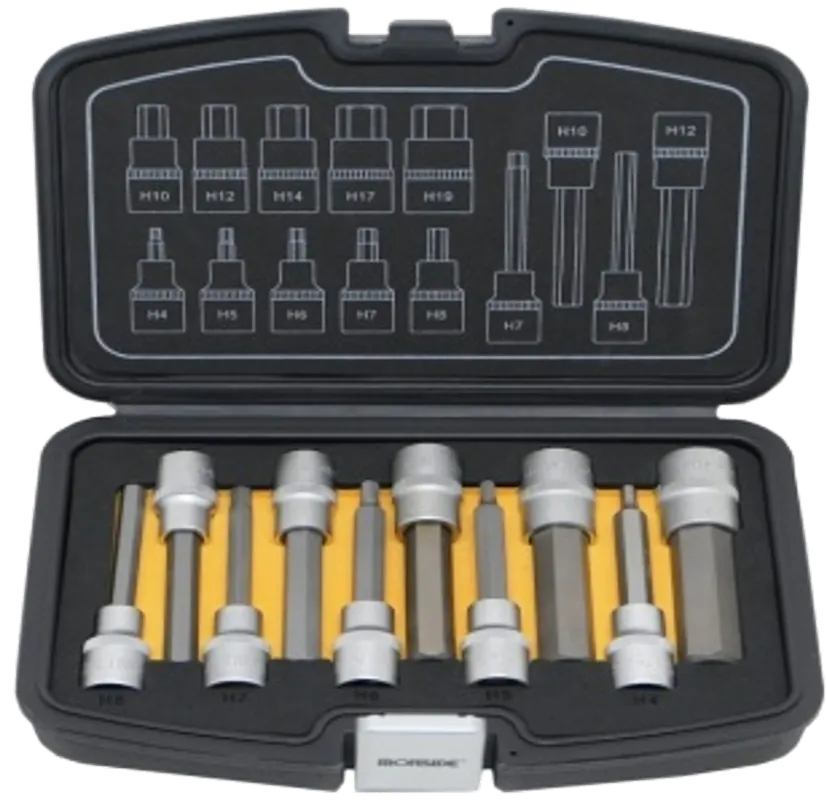 Mattförkromat kromvanadinstål. Bitshylsor för invändig sexkant med 1/2″-fäste. Innehåller 10 st bitshylsor insex 100mm; 4, 5, 6, 7, 8, 10, 12, 14, 17, 19 mm. Levereras i plastlåda med tvåfärgat EVA-inlägg, som gör det enkelt att se om någonting saknas.