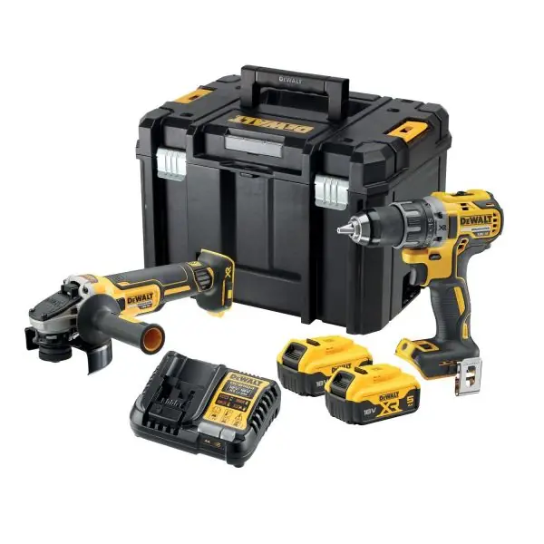 Dewalt DCK2020P2T-QW 18V XR är ett verktygspaket med 2 stycken delar: 18V XR Borr-/skruvdragare DCD791, 18V XR vinkelslip 125 mm DCG405, 2 stycken 5.0Ah batterier och 4A laddare i TSTAK II förvaringslåda.