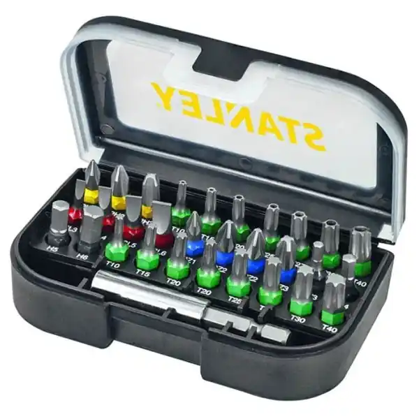 STANLEY STA60490-XJ är en bitssats i 31 delar bestående av 30 stycken färgkodade bits samt en magnetisk bitshållare. Satsen innehåller bitstyper PZ, PH, SL, T, TT samt H i olika storlekar och levereras i en förvaringslåda av plast. Tillverkade av hållbar metall med lång livslängd. För detaljerad information, se leveransomfattning nedan.
