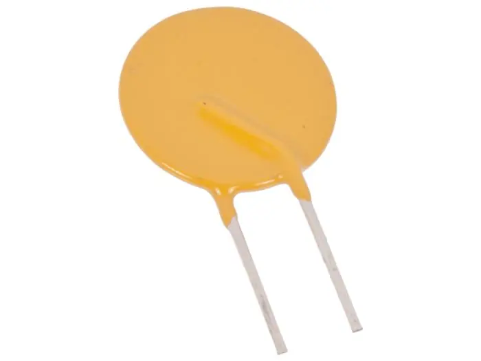 PTC-säkring i radiellt utförande. Säkringen löser ut när märkströmmen överskrids och återställs när säkringen svalnat och överströmmen är borta. Hållströmmen anger högsta säkra ström genom säkringen.