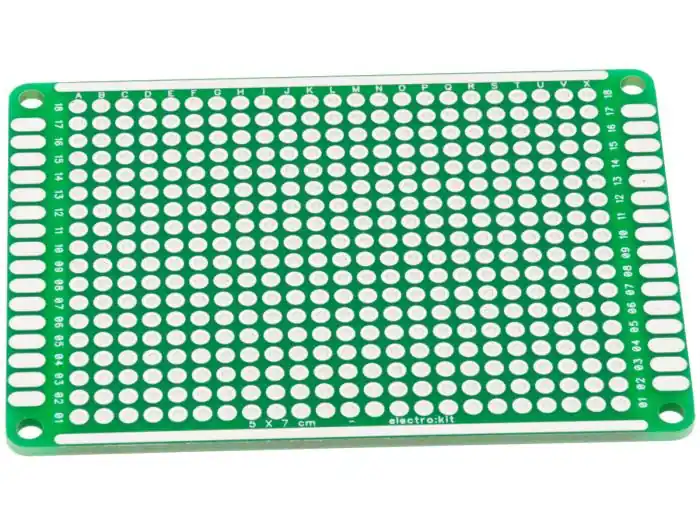Electrokit ProtoPCB EKB10 är ett experimentkort med 432 genompläterade hål och två parallella längsgående ledningsbanor för strömförsörjning. Avsett för prototyputveckling, utbildning och tillverkning av mindre serier. Kortet är dubbelsidigt med ett rutnät av lödöar. Komponenter, integrerade kretsar och ledningsförbindelser kan monteras på båda sidor av kortet. Tillverkat i FR-4 glasfibermaterial vilket ger god mekanisk stabilitet och tål upprepad lödning. Kortet har ett referensrutnät med märkning i X- och Y-led, vilket är mycket användbart vid serietillverkning och dokumentation.