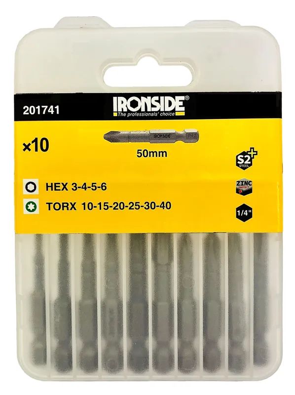 Bitssats med 10 st 75 mm långa bits med ¼” sexkantfäste. S2 Plus med zinkforfatering.