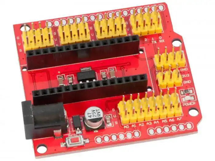Shield för Arduino Nano. Bryter ut alla Nanons GPIOs till ett mer hanterbart format. På kortet finns anslutningar för t.ex. servon, sensorer, I2C, UART, AREF och 3.3V.