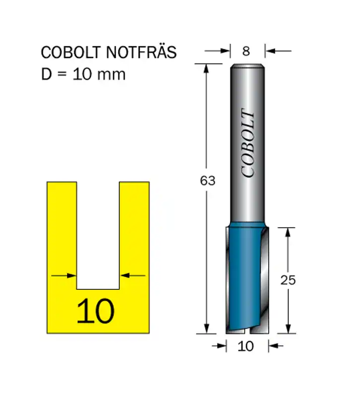 Tvåskärig notfräs med slipad botten utan separat bottenskär. Används till att fräsa notspår, falsspår, fogning i all slags trä, laminat, plast, m.m.