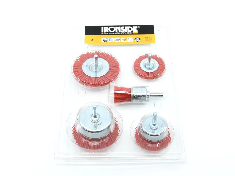 Sats med 5 nylonborstar med slipkorn för slipning och polering av mjukare metaller, plast och trä. Satsen innehåller borstar både för större ytor och trängre utrymmen. Med 6mm tapp för montering i borrmaskin.