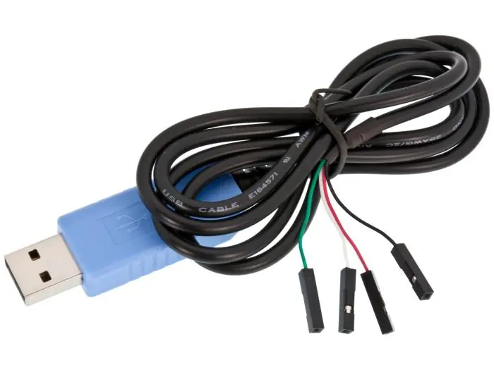 Fyra anslutningar (dupont): +5 V (från USB-porten), RX, TX och GND. RX/TX är anpassade för 3.3 V-logik.