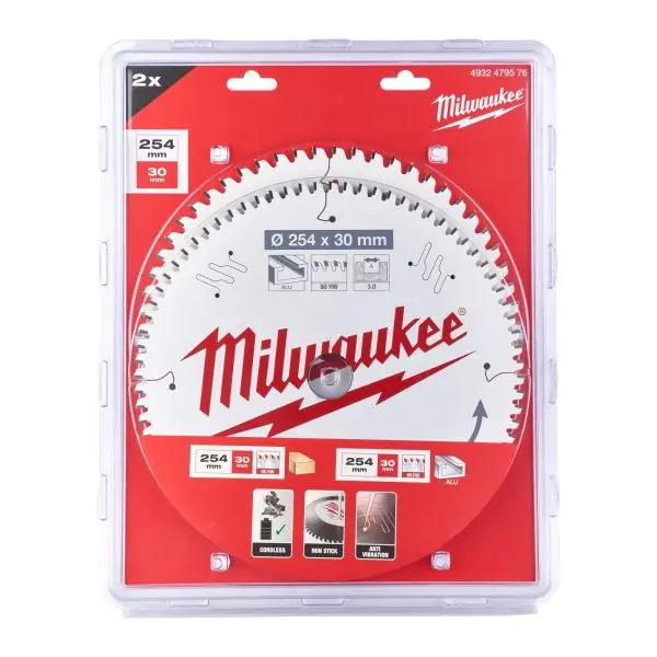 Milwaukee 4932479576 är ett paket med sågklingor som innehåller en cirkelsågklinga för trä på 254 x 30 mm med 60 tänder samt en cirkelsågklinga för aluminium 254 x 30 mm med 80 tänder. Sågklingorna har PTFE-beläggning vilket gör att de kapar svalare och utan att materialet fastnar på klingan. Skyddar mot korrosion och ansamling av harts.
