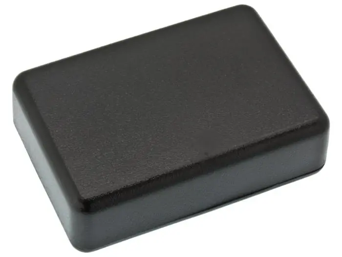 Liten apparatlåda från Hammond. Lådan skruvas ihop med icke-genomgående skruv och har två fästpunkter för kretskort. Se datablad för utförliga mått samt rekommenderade kretskortsdimensioner.