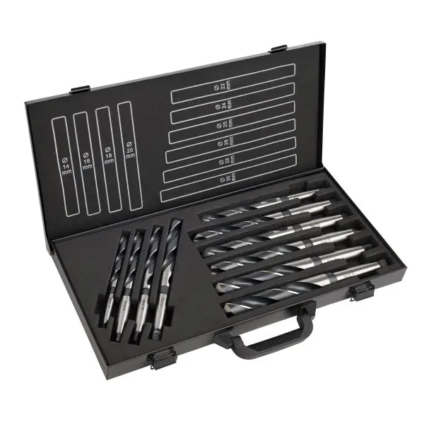 Sats med borrar som är lämpliga för stål (N/mm2), aluminium, mässing, brons och gjutjärn.