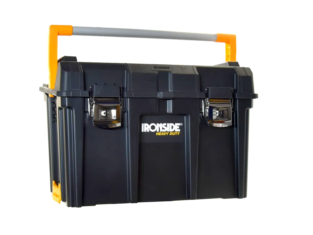 Robust verktygsbox med kraftiga spännen i metall. Inbyggd tätning vid locket gör att boxen är vattentät. Klassning IP66. Boxen innehåller flyttbara avdelare. Verktygsboxen kan användas separat eller integreras med de andra två modulboxarna på transportkärran eller modulvagnen. Mått: H404xB590xD345 mm. Vikt 4,4 kg.