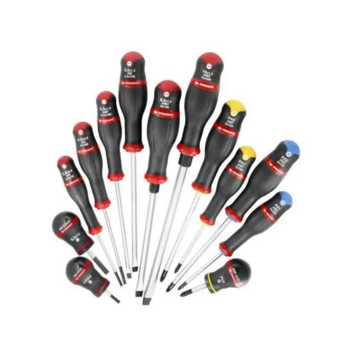 Facom ATWH.J13 är ett skruvmejselset i 13 delar. Skruvmejslarna erbjuder unik design av flera komponenthandtag för snabb ergonomisk skruvning med 10% högre vridmoment jämfört med vanliga skruvmejslar. Zink, nickel och krombelagda blad garanterar maximal korrosionsbeständighet och överlägsen prestanda.