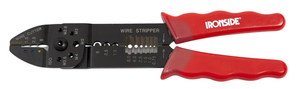 Kabelskotång för kontaktpressning av röda-blå-gula kabelskor och skarvar utan lödning. Med klippskär för avklippning av bultar M2.6, 3, 3.5, 4.5 utan att gängorna skadas. Tången har ett speciellt skär för kapning av ledningstråden samt särskilda skalskär för avsiolering.