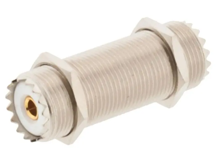 SO239 UHF genomföring. Längd: 44.5mm. Kan användas för att förenkla antenngenomföringar i väggar. Mittstift av guldpläterad mässing, dielektrikum av POM och hölje av nickelpläterad mässing.