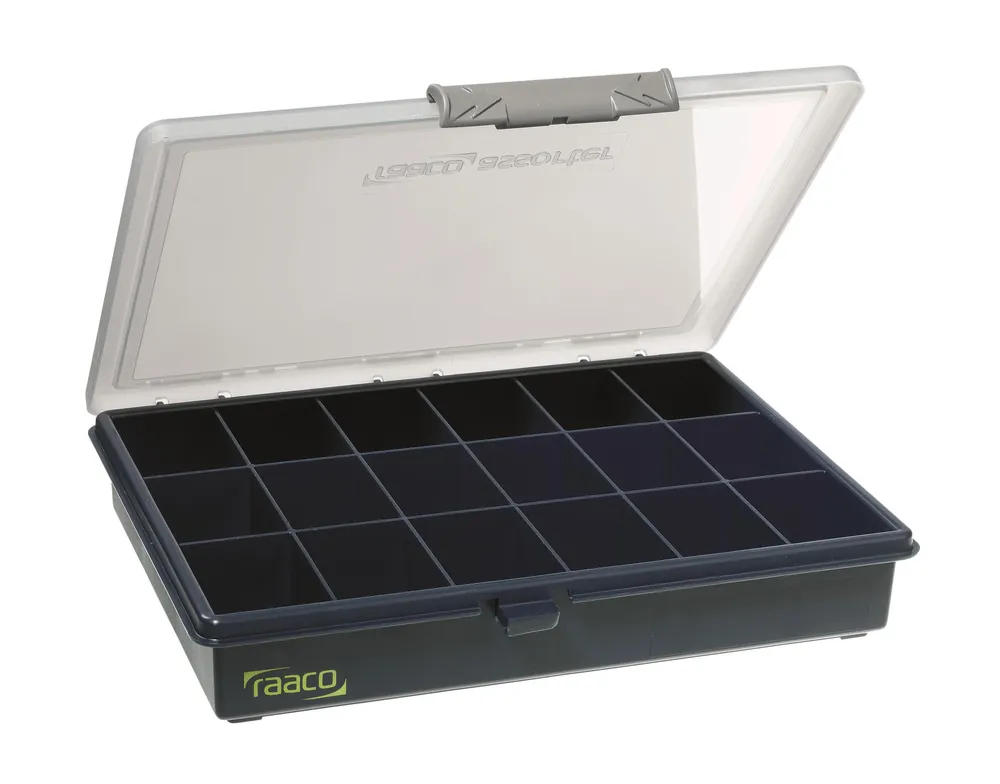 Sortimentlåda med 9 fasta fack. Försedd med skjutlås.