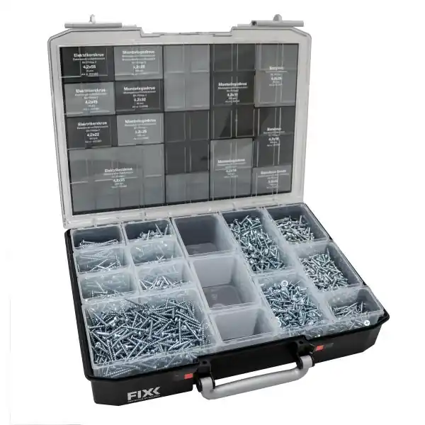 Sortimentsväska med 2800 stycken skruvar anpassat till elektriker. Innehållandes elektrikerskruv, montageskruv, montageskruv med borrspets, borrskruv och gipsskruv Kombi.