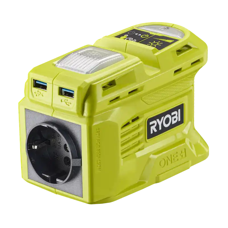 Ryobi RY18BI150B 18V ONE+ är en spänningsomvandlare med 2 st USB-A-portar, 1 st USBA-C-port och en AC plugg för att driva alla AC-enheter utan internt batteri samt ladda alla DC-enheter från ditt 18V batteripaket. Verktyget har en inbyggd laddare och där kan du ladda dina 18V batterier samtidigt som du använder AC-porten. Spänningsomvandlaren tillhandahåller 150 W kontinuerlig ström upp till 225 W. Perfekt för att driva enheter som surfplattor, elverktyg, lampor, högtalare och andra USB-drivna enheter. Den är idealisk för camping, semester eller närsomhelst när du behöver ström. PÅ/AV-knapp kontrollerar laddningen. Laddningshastighet upp till 1,7 Ah. Batteri och laddare säljs separat. Kompatibel med alla trädgårds- och elverktyg i Ryobi 18V-serien. En del av ONE+ systemet.