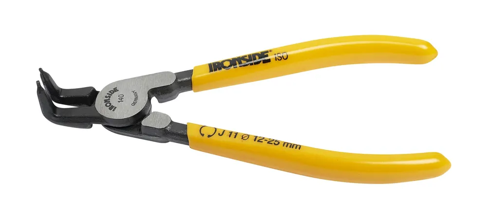 En böjd spårringstång med längden 135 mm, som har ett polerat skyddslackerat huvud och plastdoppade grepphylsor. Lämpar sig för invändiga spårringar. Med fastspänningsområde på 12-25 mm.