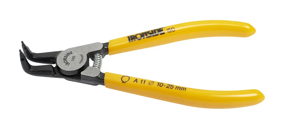 En böjd spårringstång med längden 165 mm, som har ett polerat skyddslackerat huvud och plastdoppade grepphylsor. För utvändiga spårringar. Med diameter 19-60 mm.