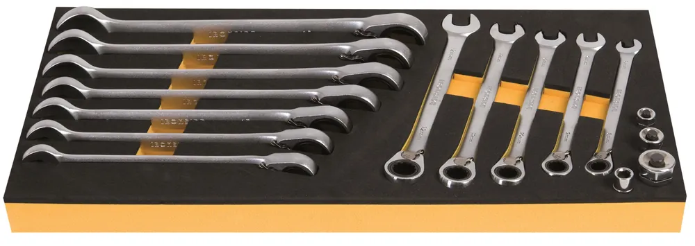 En 16 delar spärrkombinyckelsats innehållandes 12 stycken spärrkombinycklar i mattförkromat kromvanadinstål. Ringhuvudet är uppviklat 15°, snabb omställning av dragriktiningen. Satsen innehåller även 4 stycken adaptrar och levereras i en EVA-skumplastlåda.