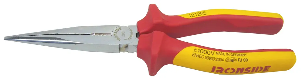 Spetstång tillverkad i kromvanadinstål, med förkromat huvud. Tången har raka käftar med räfflade gripytor, sidavbitare samt ergonomiskt utformade grepphylsor av tvåkomponentsmaterial. Godkänd för arbete under spänning upp till 1000 V.