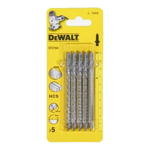 Dewalt DT2164 är ett 5-pack sticksågblad för att såga rena, raka snitt i trä, spånskivor, plywood, laminerade spånskivor och plast upp till 60mm tjock.