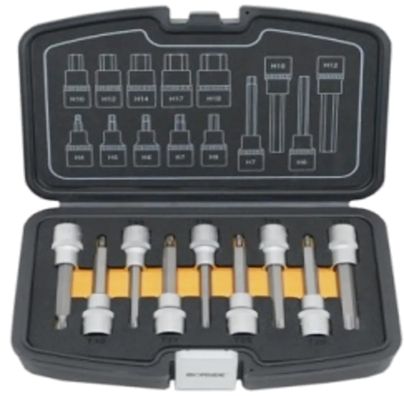 Mattförkromat kromvanadinstål. Bitshylsor för invändig sexkant med 1/2″-fäste. Innehåller 9 st bitshylsor Torx 100mm; TX20, TX25, TX27, TX30, TX40, TX45, TX50, TX55, TX60. Levereras i plastlåda med tvåfärgat EVA-inlägg, som gör det enkelt att se om någonting saknas.