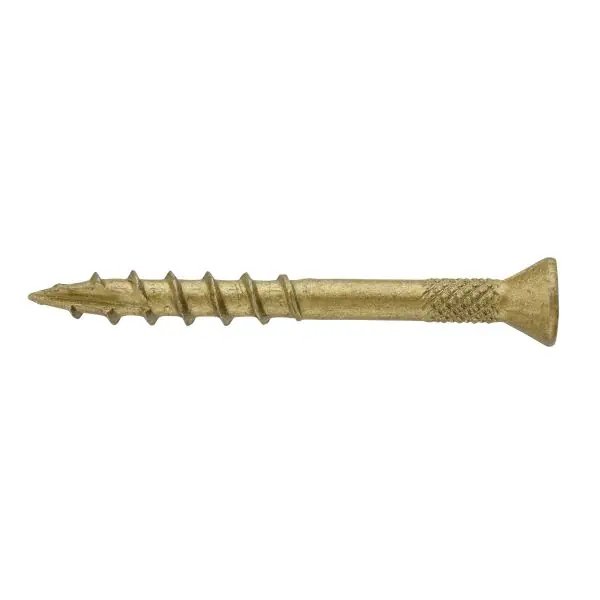 Trallskruv med försänkt skalle med rillor för montering av trall, staket, utomhuspaneler m.m. Skruven har en skärande borrspets för att förhindra sprickbildning i trä.