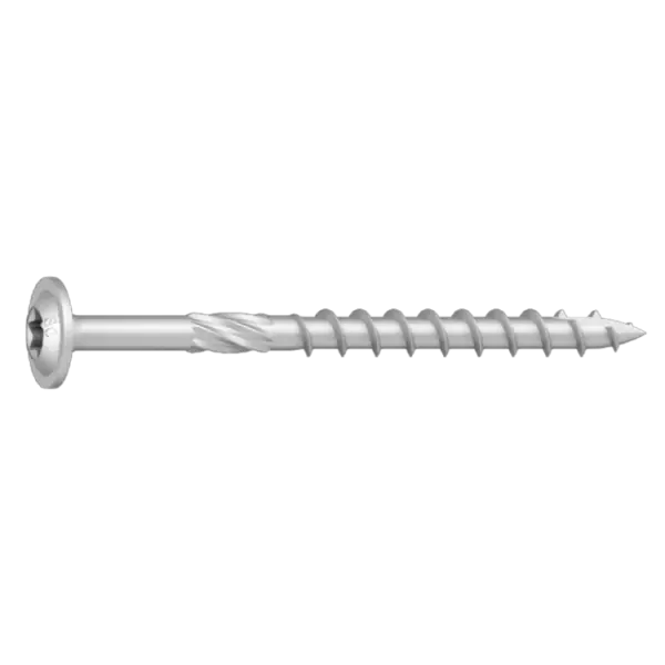 Träskruv på Ø6 mm som är tillverkad av härdat kolstål med C4-klassad ytbehandling, avsedd för användning utomhus som med fördel ersätter fransk träskruv. Skruven har ett stort brickhuvud för bättre genomdragningsvärden vilket är viktigt vid trä-mot-trä konstruktioner. Huvudet har även låg bygghöjd vilket kan vara en fördel för montaget. Skruvhuvudets undersida är utformad så att den ska passa korrekt vid montage i balk och stolpskor. Spets med skärkant, fräsvingar på de första gängvarven och även stamfräs på alla skruvar med längd från 50 mm vilket ger skruven ett lågt iskruvningsmoment. ISO 14592:2008. Levereras i 100-pack.