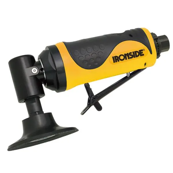 Roterande vinkelputsmaskin på 367 W från Ironside. Avsedd för slipning, putsning och polering på mindre ytor. Levereras med en 76 mm Roloc hållare, men kan tack vare ¼” gängan och varvtalet även användas tillsammans med 50 mm Roloc hållare och rondeller. Vinkelhuset är av en modell med låg profil och har ett luftutsläpp bakåt.