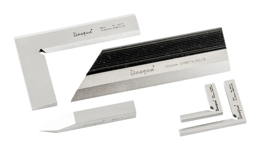 Dasqua 495203 är en mätverktygsats i 5 delar av rostfritt stål med mattförkromad finish. Satsen innehåller 3 stycken eggvinklar (DIN 875/00) i storlekarna 25 x 20 mm, 40 x 28 mm och 75 x 50 mm, en egglinjal DIN 874/00 på 100 mm samt en ritsspets på 60x8x8 mm.
