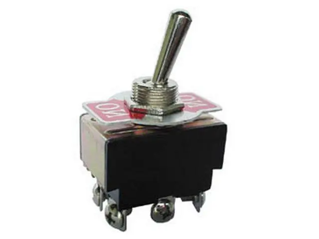 Stor vippomkopplare med skylt. 2-pol växlande (DPDT) med mittläge. Fasta ändlägen.
