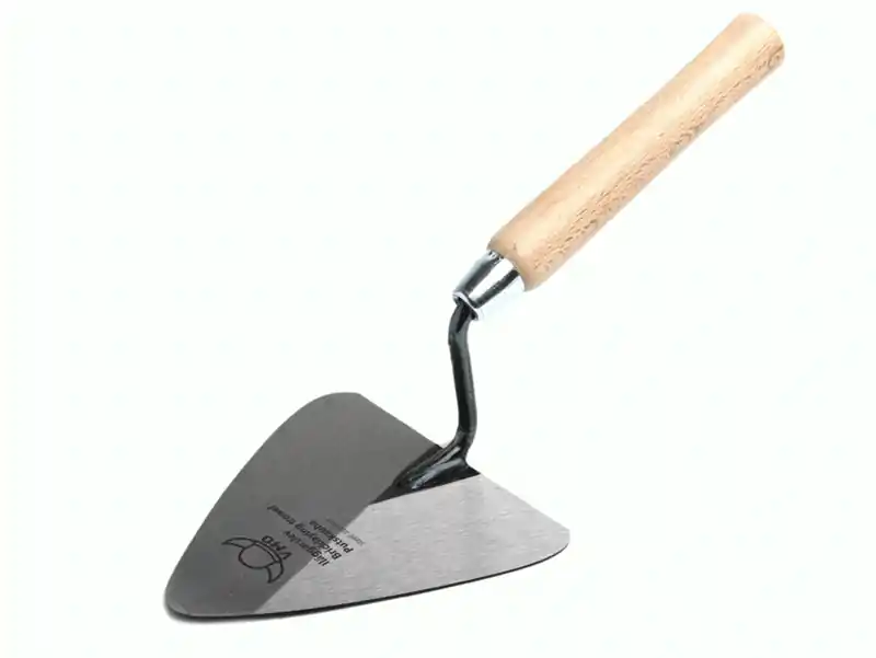 Långt trähandtag med trekantigt blad av stål.