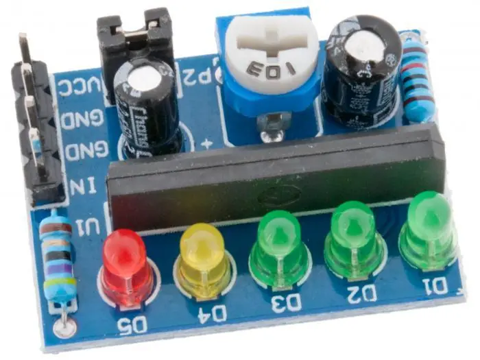 Liten modul med 5 lysdioder och drivkretsen KA2284. Modulen kan användas för att mäta signalnivåer, t.ex. ljud eller batterispänning. Förstärkningen kan justeras med en trimpotentiometer och ingången kan byglas för att fungera med antingen AC- eller DC-signaler.