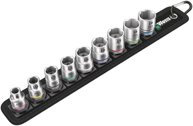 Robust textilbälte i det typiska Wera-utförandet, med 9 hylsor på minimalt utrymme. En smidig vridmekanism säkerställer att hylsorna förvaras säkert, men lätt kan tas loss. Med verktygsväljare ”Take it easy” med färgkodning enligt storlek – för enkelt och snabbt val av rätt verktyg.