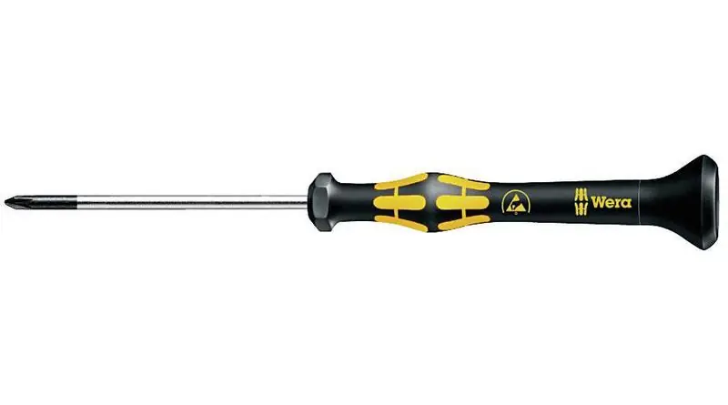 Wera typ Micro 1550 PH. ESD-skyddade. För Philip kryss-spår. Rund klinga med ”Black-Point”-märkt mejselspets. Konkav rolltopp. Sexkantformad liggyta som gör att mejseln ej rullar på arbetsbordet.
